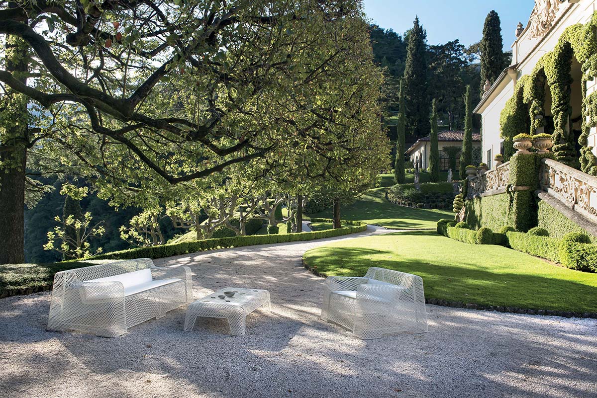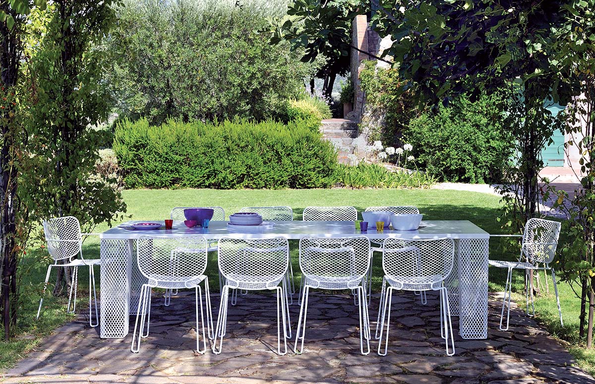 Karakteristika kolekcije je metalna mreža od čeličnog lima. Interpretacija novog koncepta za boravak na otvorenom – čelični dnevni boravak u industrijskom stilu, dodatni jastuci.