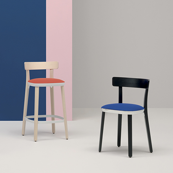 Drvena barska stolica od jasena, u strukturi je Alu prsten u kojem je sjedište od štofa, kože ili eko kože.