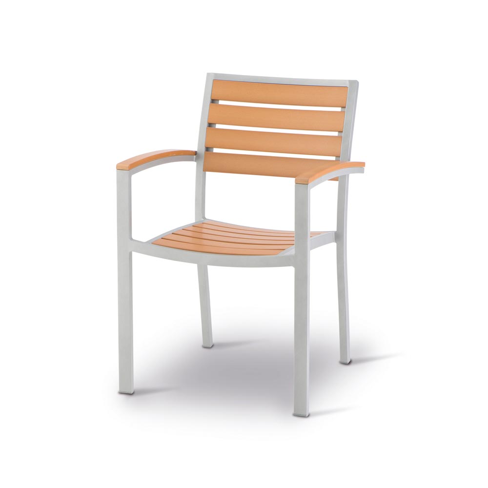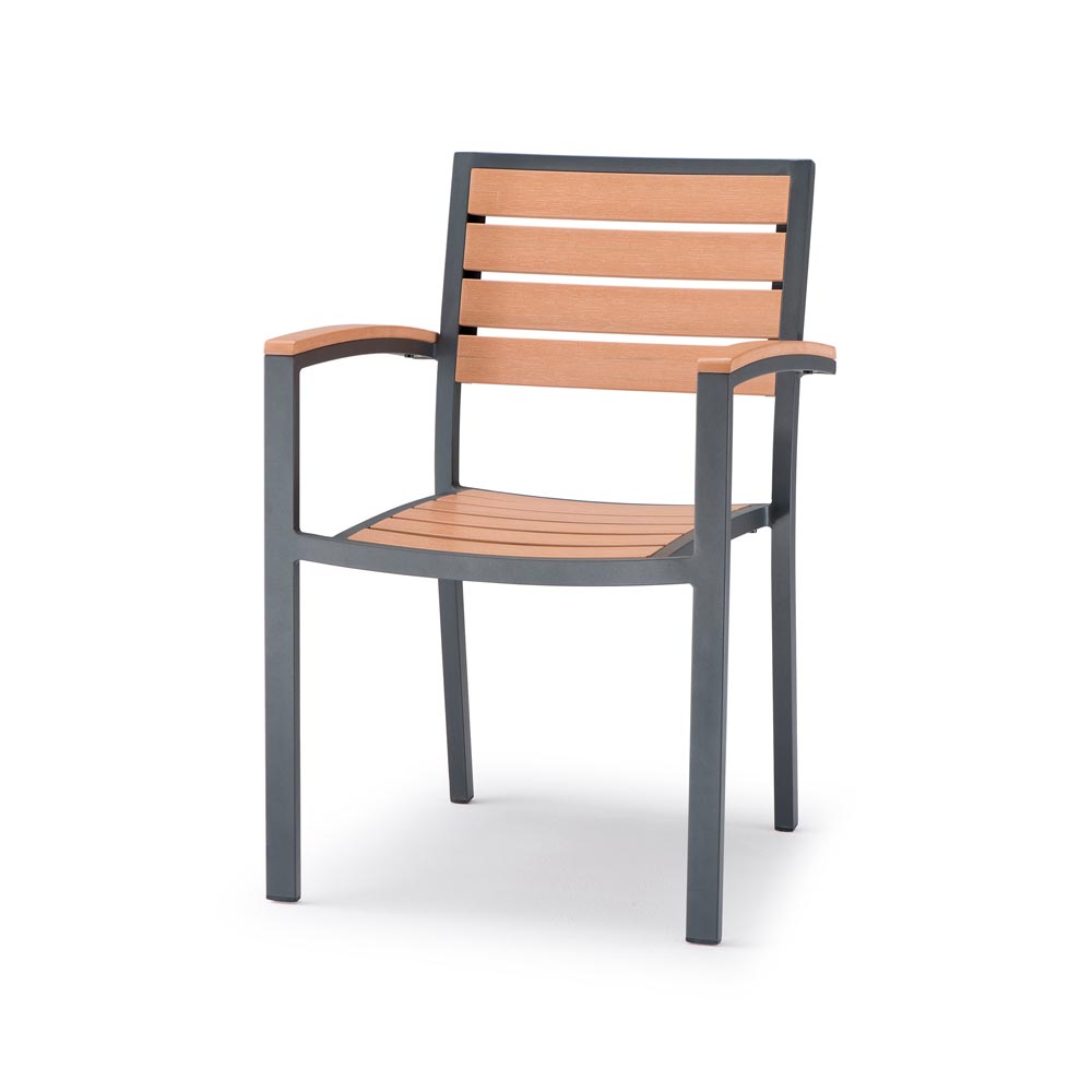 Stolica izrađena od aluminijskog okvira, drvenog sjedišta i naslona.
